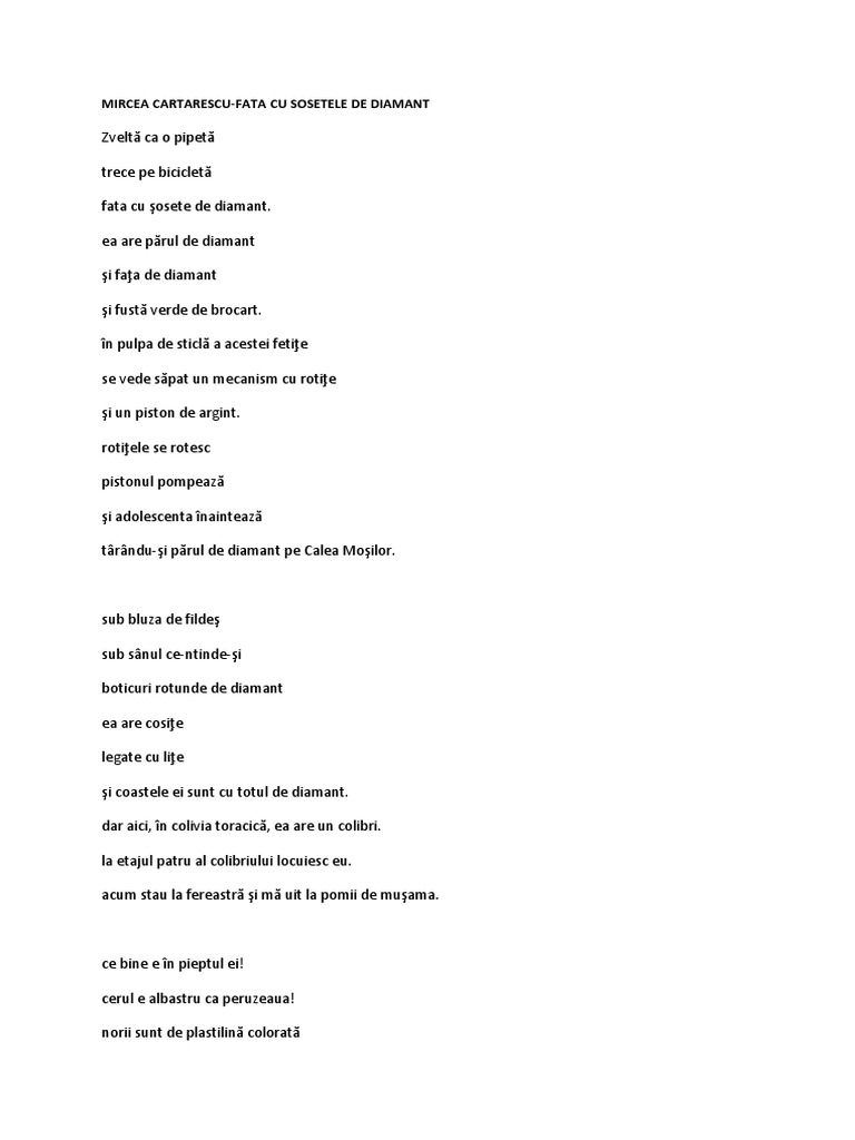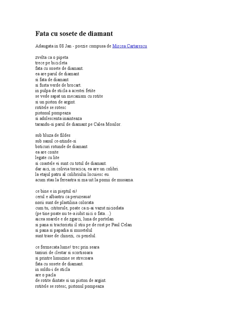 Fata cu şosete de diamant. Rotiţele se rotesc pistonul pompează şi adolescenta înaintează târându şi părul de diamant pe calea moşilor. Fata cu şosete de diamant. Ea are părul de diamant şi faţa de diamant şi fustă verde de brocart.