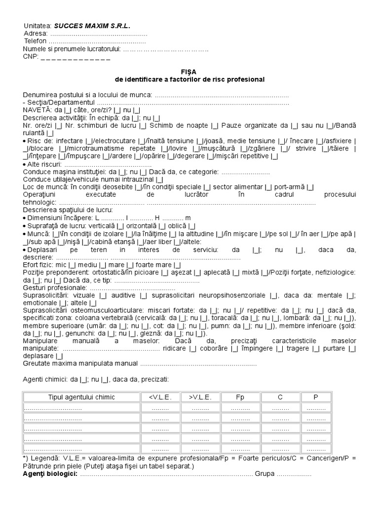 Fisa de expunere la riscuri profesionale. Daca da se va completa partea speciala. Deplasări pe teren în interesul serviciului. Inregistrarile medicale sunt pastrate o perioada de timp cel putin egala cu durata medie de expunere afectare. Prezintă riscurile profesionale detaliate în fişa de identificare a factorilor de risc profesional anexată prezentei cereri.