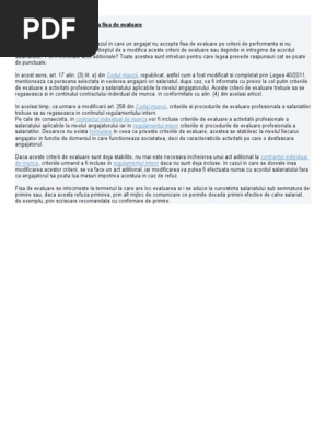 Va propunem in continuare un model orientativ de fisa cu privire la evaluarea salariatilor cu o marime de 5 pagini si structurat sub forma de 8 puncte principale. Consultant si consilier juridic evaluarea obligatorie. Modelul contine la final si explicatii cu privire la semnificatia calificativelor acordate dar si o procedura cu privire la evaluarea performantelor profesionale.