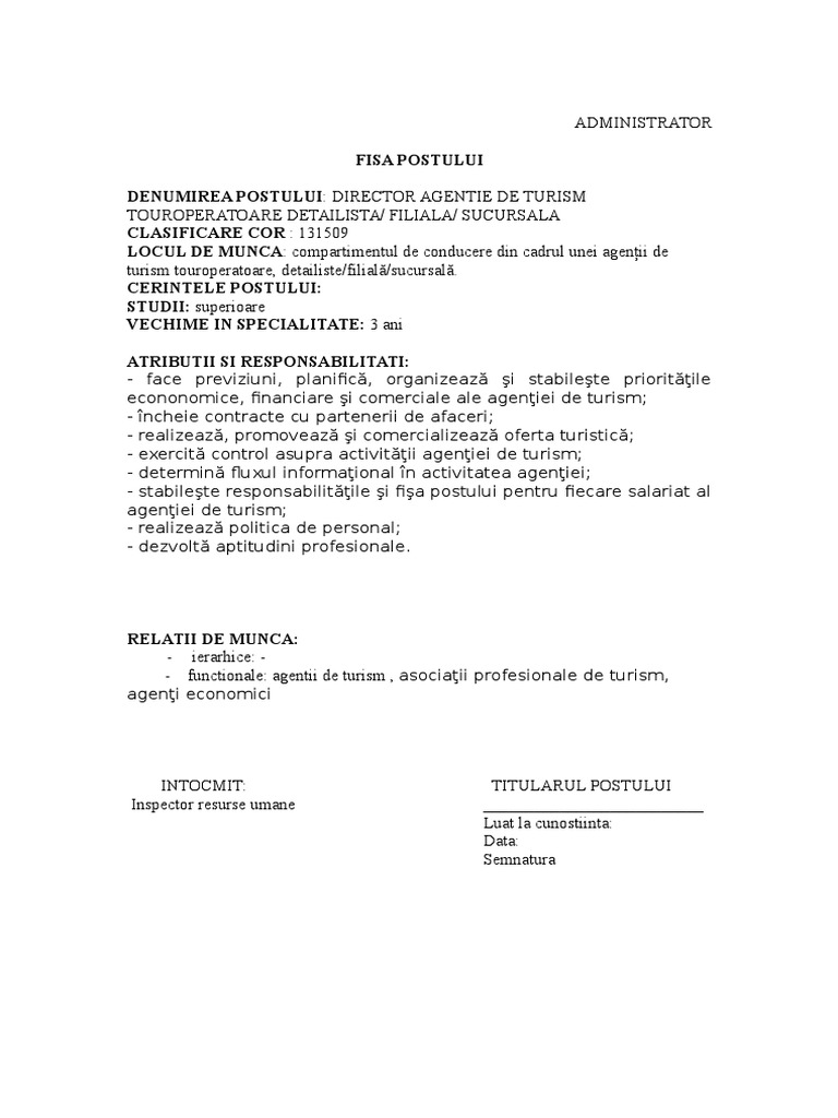 Fisa de post administrator pensiune. Titularul postului are rolul de a asigura conducerea organizarea şi funcţionarea firmei cu eficienţă maximă prin elaborarea strategiilor de dezvoltare identificarea oportunităţilor angajarea resurselor financiare tehnologice şi umane necesare. Fisa postului director societate comerciala. Vizualizati instant acest raspuns platind prin sms.