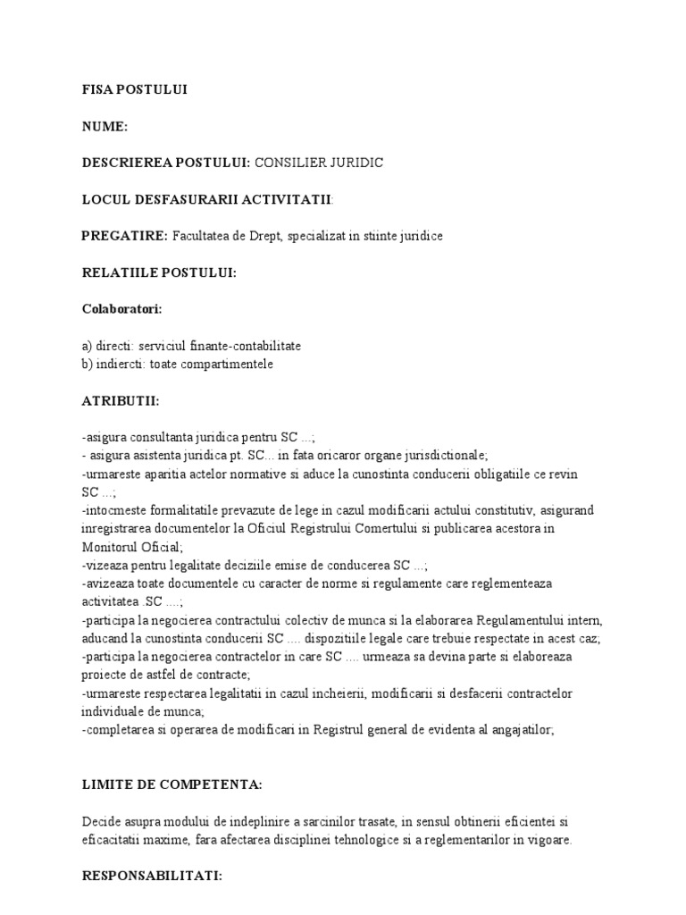 Model fisa postului consilier juridic identificarea postului numele si prenumele titularului. Toata lista fise de post fisa de post anterioara fisa de post urmatoare manual politici și proceduri contabile personalizat editabil. Pozitia in cor cod. 7 domenii de activitate versiune simplificata.