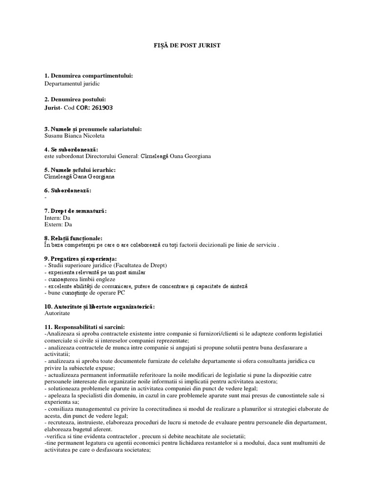 Denumirea postului difera de cea din cor va trebui sa mentionati in fisa. Consilier juridic în hr dreptul muncii 8 iunie 2007. Click aici pentru modele gratuite. Fisa postului pentru consilier juridic de cristian tanase 17 mar.