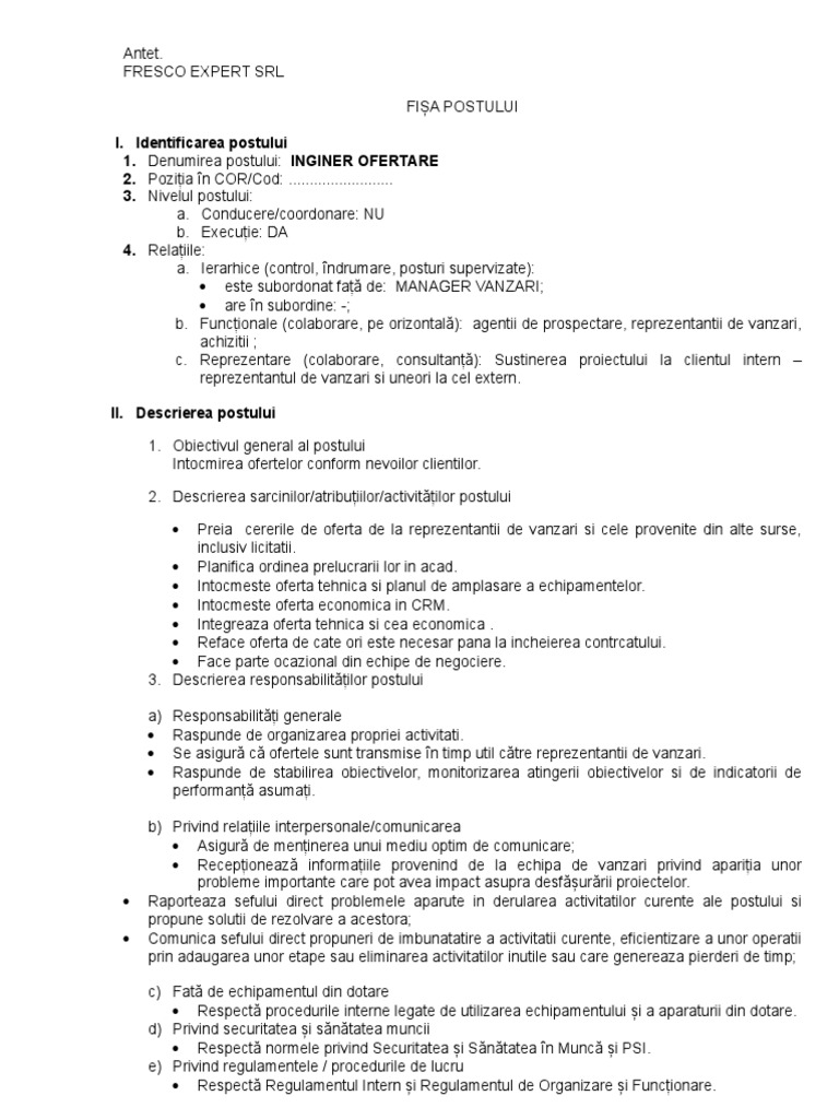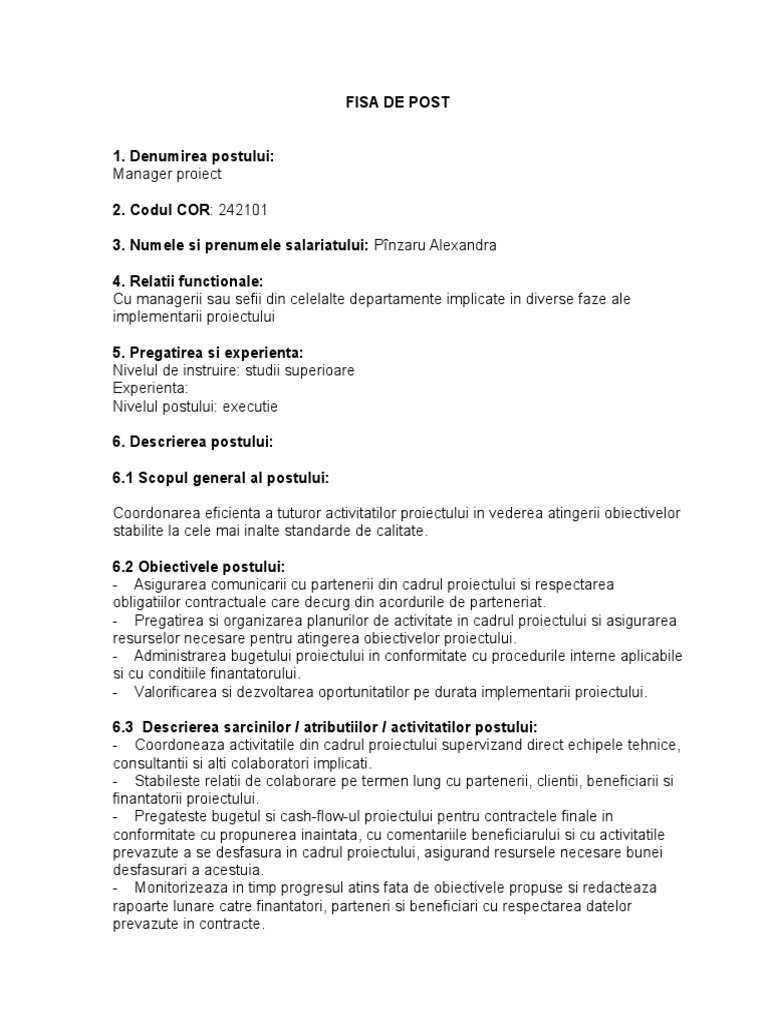 Fisa postului manager de proiect. Identificarea postului numele si. Contract individual de munca plus dosar angajare fisa postului programator sistem informatic. Clasificare cor clasificarea ocupatilor din romania. Fisa de post manager de proiect exemplu 1.