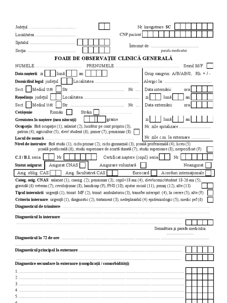 Foaie de observatie completata interne. Cerere autorizare ingrijire la domiciliu. Instrucțiuni privind completarea formularului foaie de observație clinică generală focg anexa nr. Parafa medicului fişă de spitalizare de zi statut asigurat. Asigurat cnas asigurare voluntară neasigurat tip asig.