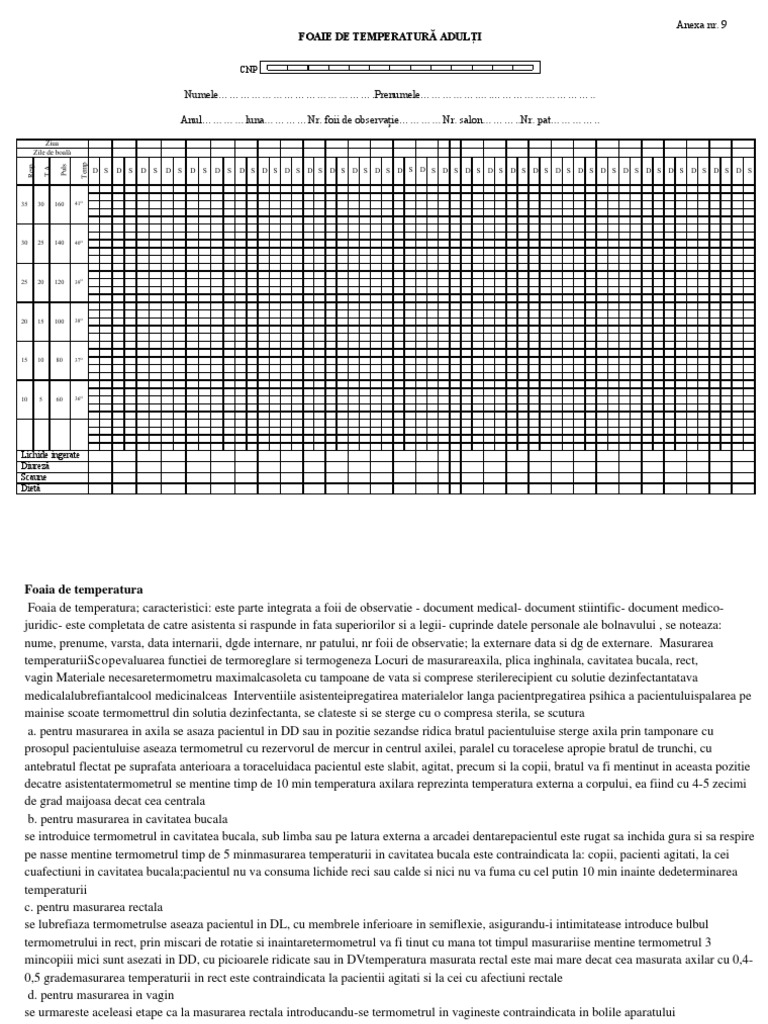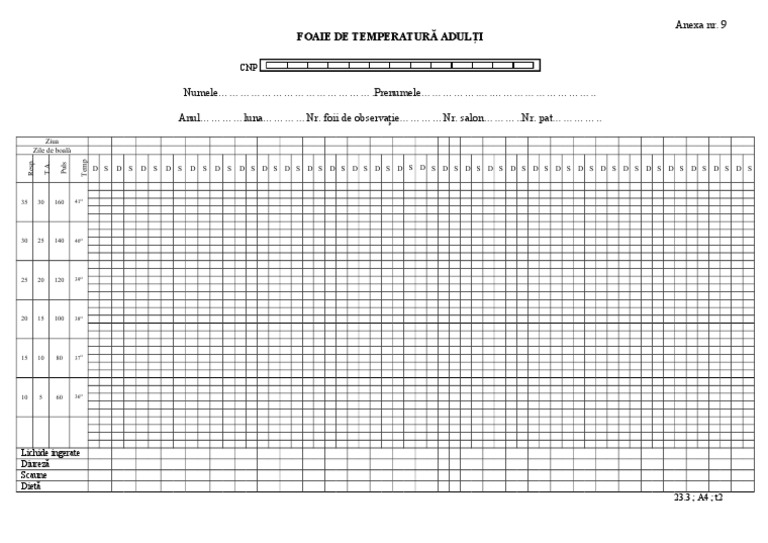 9 foaie de temperatura adulti cnp numele prenumele. Foaie de temperatura adulti anexa nr. Foaia de temperatură este o anexă a foii de observație și se completează de către asistentul medical. Foaie temperatura adulti anexa 9 format a3 suport hartie offset 60g mp tipar fata fila.