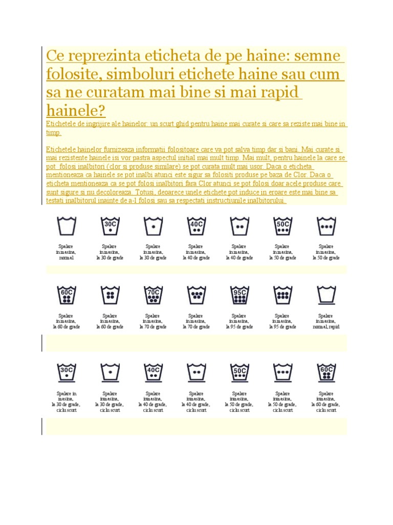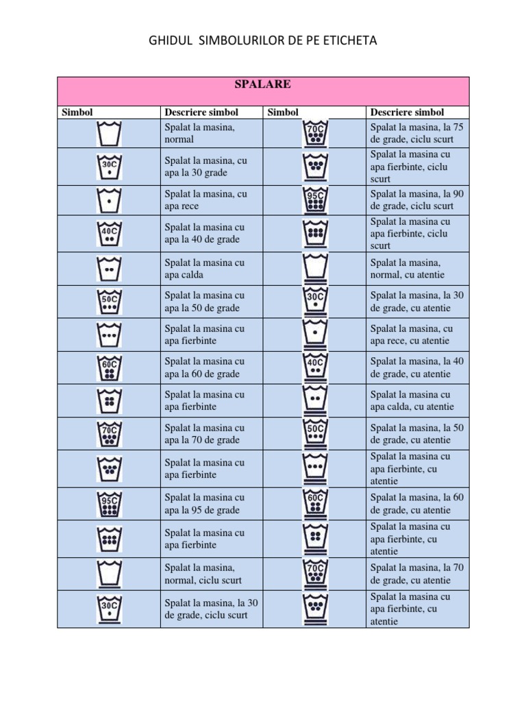 Nu se vor folosi produsele din comerţ pentru îndepărtarea petelor pe bază de solvent. Lista simboluri pe etichete spalat simbol descriere simbol spalat la masina normal spalat la masina cu apa la 30 grade spalat la masina cu apa rece spalat la masina cu apa la 40 de grade spalat la masina cu apa calda spalat la masina cu apa la 50 de grade spalat la masina cu apa fierbinte spalat la masina cu apa la 60 de grade.
