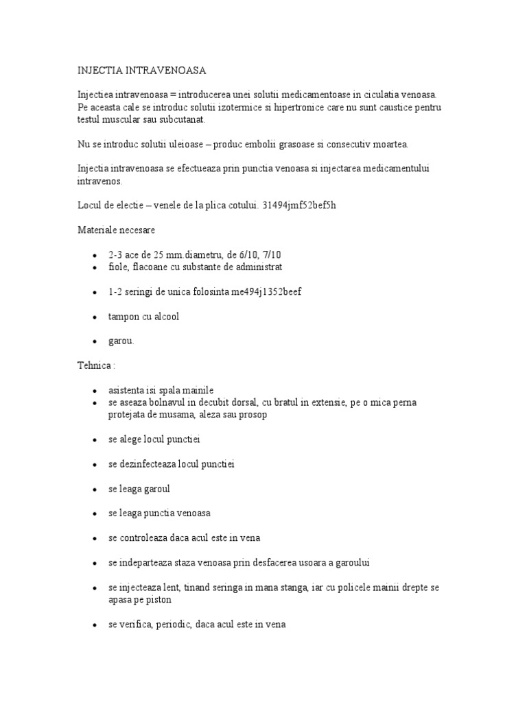 Injecția intravenoasă reprezintă administrarea unei substante medicamentoase direct in sistemul vascular aceasta tehnica permite o actiune terapeutica rapida de aceea se alege atunci cand se doreste un efect imediat.