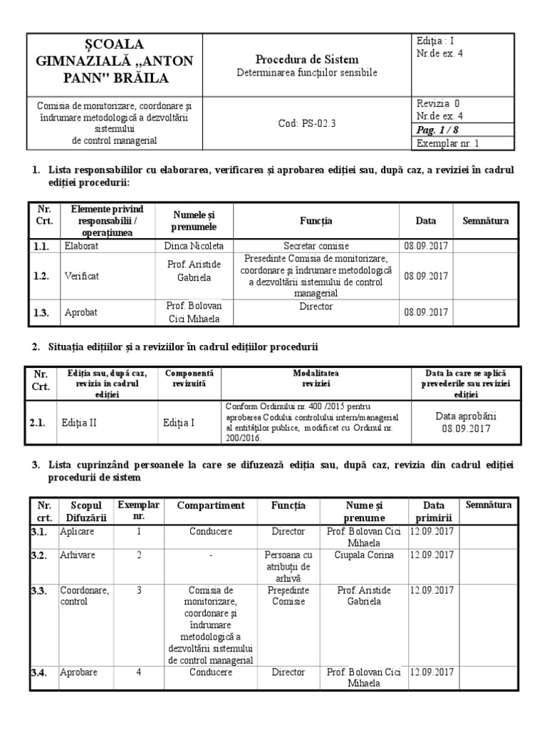 Inventarul functiilor sensibile scoala. Lista cu salariaţii care ocupă funcţii sensibile. Procedură regulament instrucţiune de lucru prezentarea formalizată în scris a tuturor paşilor ce trebuie urmaţi a metodelor de lucru stabilite şi a regulilor de aplicat în vederea realizării activităţii cu privire la aspectul procesual. Analiza functii sensibile 411 2017 analiza functii sensibile 411 2017 819 kb. în inventarul funcţiilor sensibile sunt reflectate de regulă acele funcţii care prezintă riscuri semnificative în raport cu obiectivele.