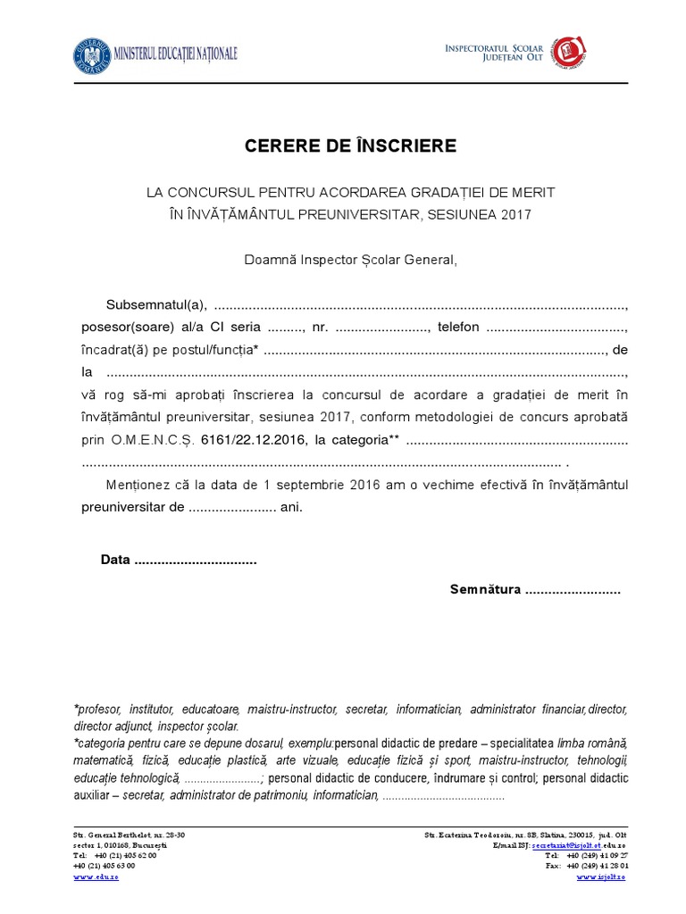 Eventualele contestații se pot depune în data de 08 10 2020 în intervalul orar 16 00 20 00. Meniu prima pagina. Pagina oficiala a inspectoratului scolar judetean olt. 1 la metodologia şi criteriile privind acordarea gradaţiei de merit personalului didactic din învăţământul preuniversitar de stat în sesiunea 2017 aprobate prin ordinul ministrului educaţiei naţionale şi cercetării ştiinţifice nr.